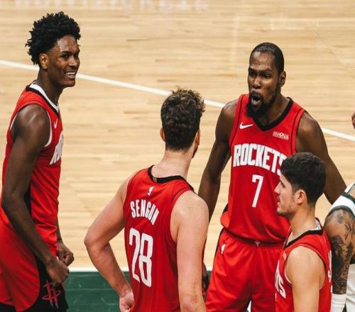 本场比赛火箭队的第二功臣是杜兰特,虽然这位老将24投11中,命中率一般,但他三分球9中4,罚球9中7,全场也轰下了33分,并且摘下了8个篮板,送出2次抢断。